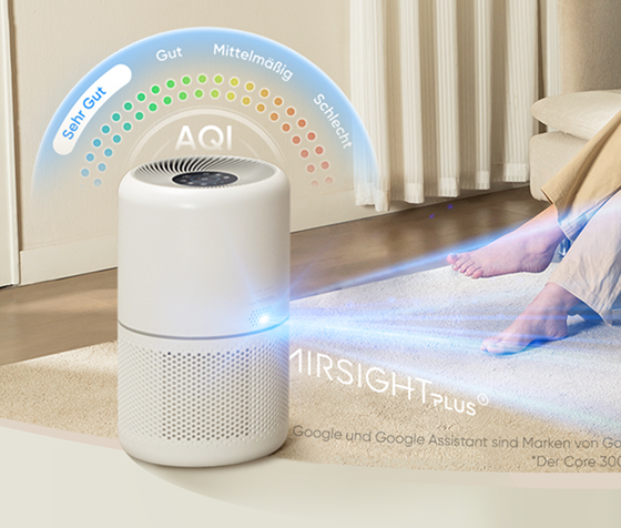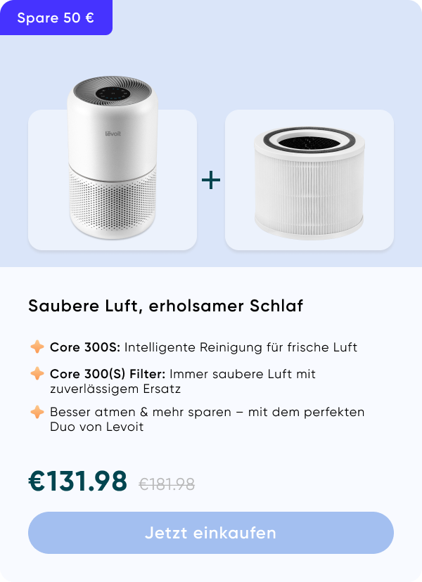 Der Levoit Core 300S bietet intelligente Luftreinigung mit HEPA-Filter, einem Lasersensor zur Luftqualitätsmessung, spezialisierten Filtern für Tierhaare, Schimmel und Abgase sowie einfacher Steuerung über die VeSync-App – alles bei flüsterleisem Betrieb und niedrigem Energieverbrauch.