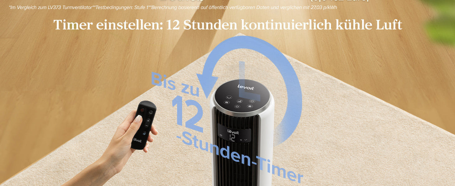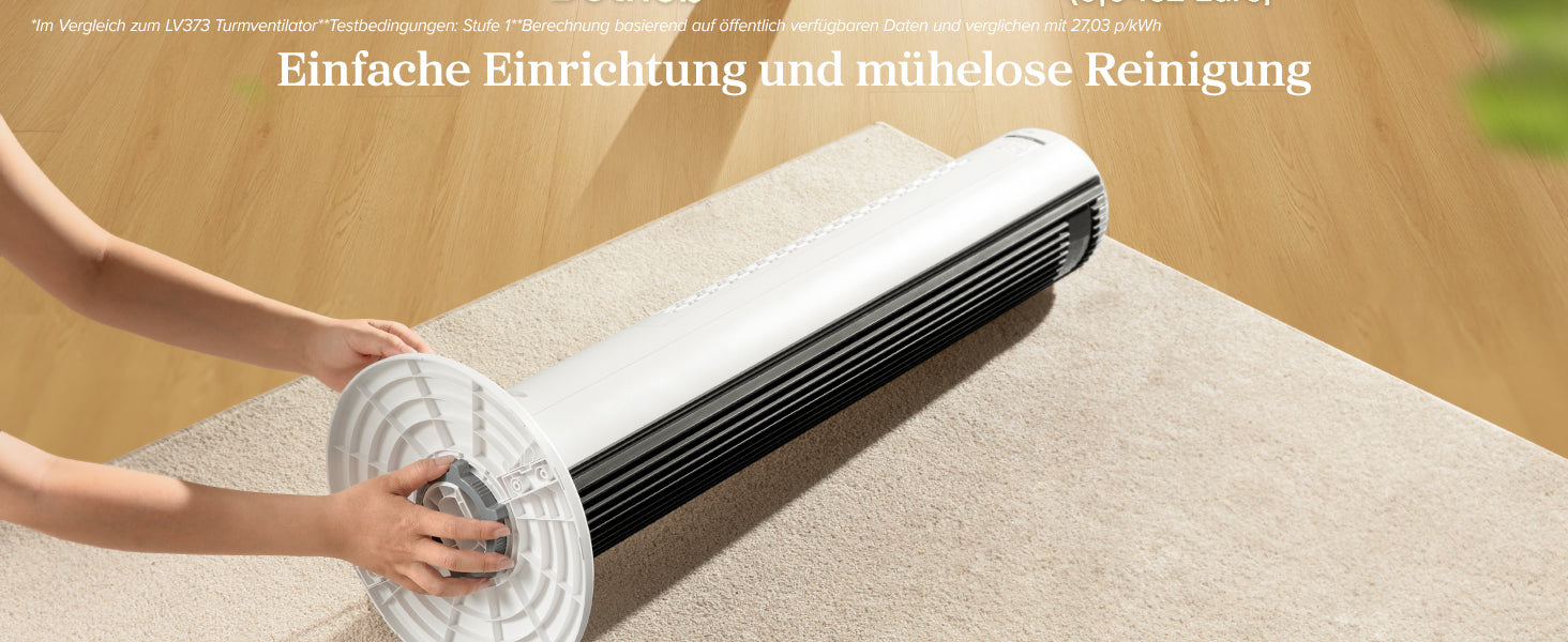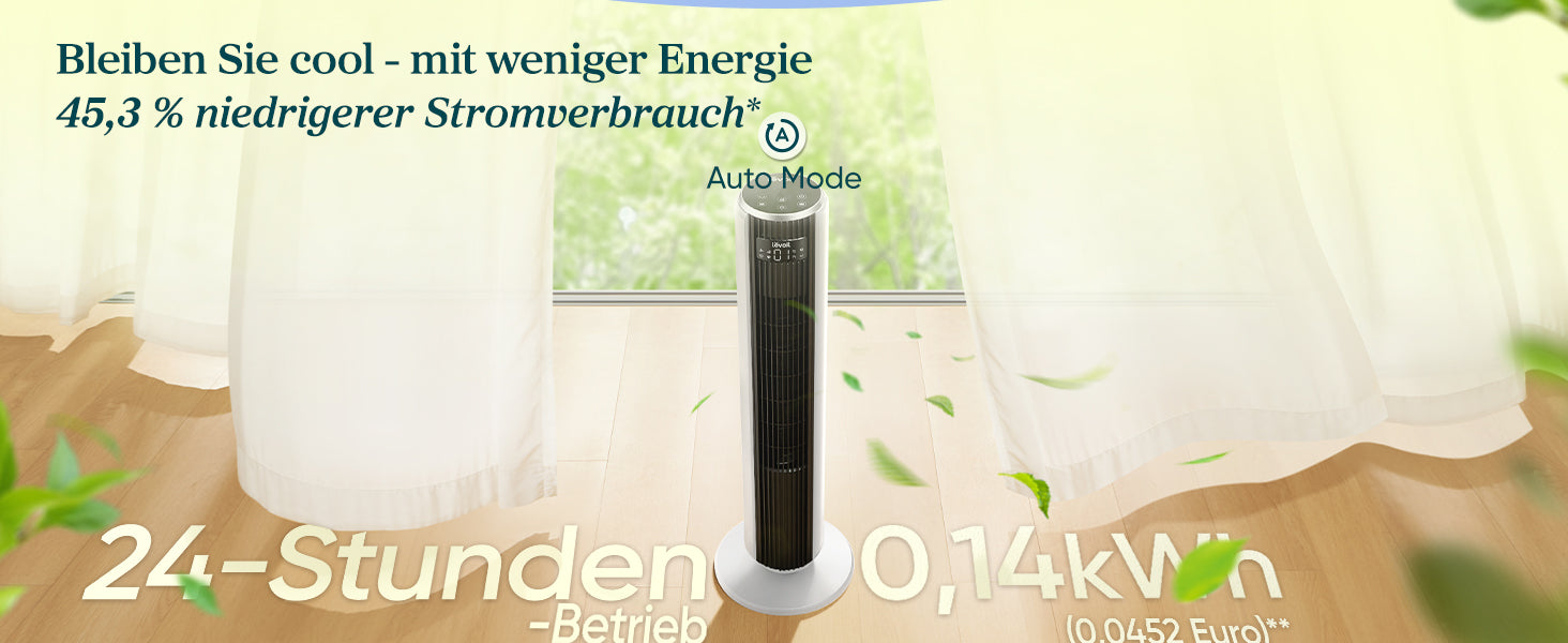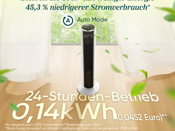 Energieeffizienterer DC-Motor: Dieser Turmventilator verwendet einen Gleichstrommotor mit einer Leistung von nur 24 W; Bei ganztägiger Nutzung kostet dies nur 0,06 €, sodass Sie sich keine Gedanken über die Kosten machen müssen