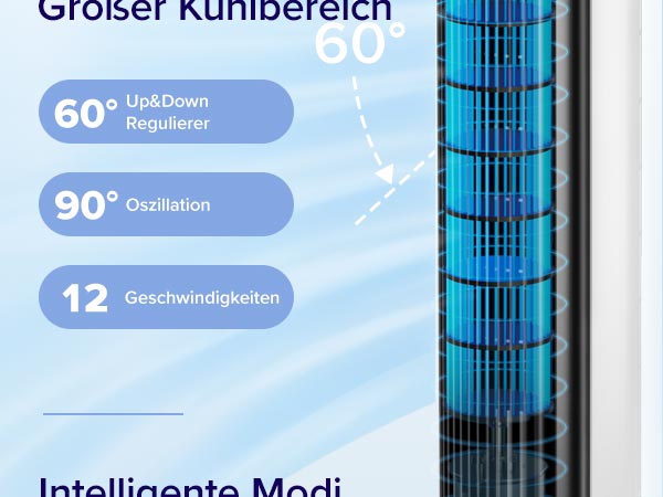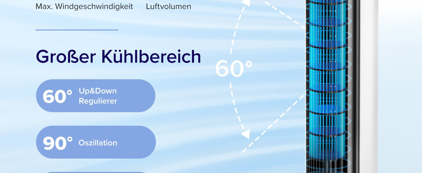 Größerer Kühlbereich: Mit einstellbarem 60° Auf- und Abwärtsbewegung und 90° Oszillation bietet Ihnen einen größeren Kühlbereich; Lass jedes Mitglied Ihrer Familie die kühle Sommerbrise genießen.