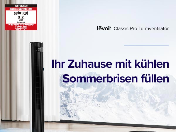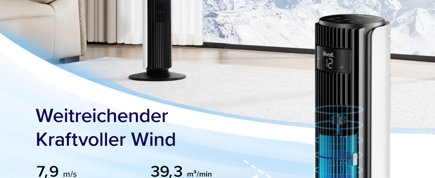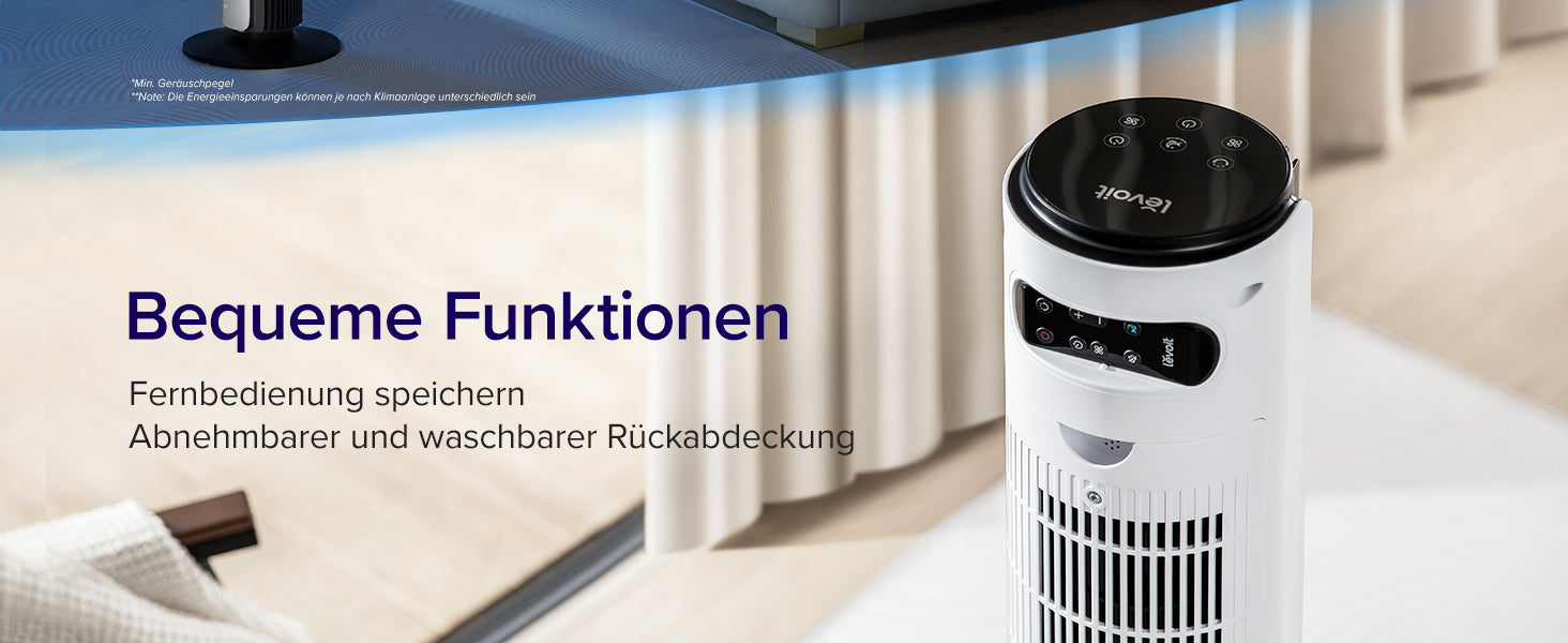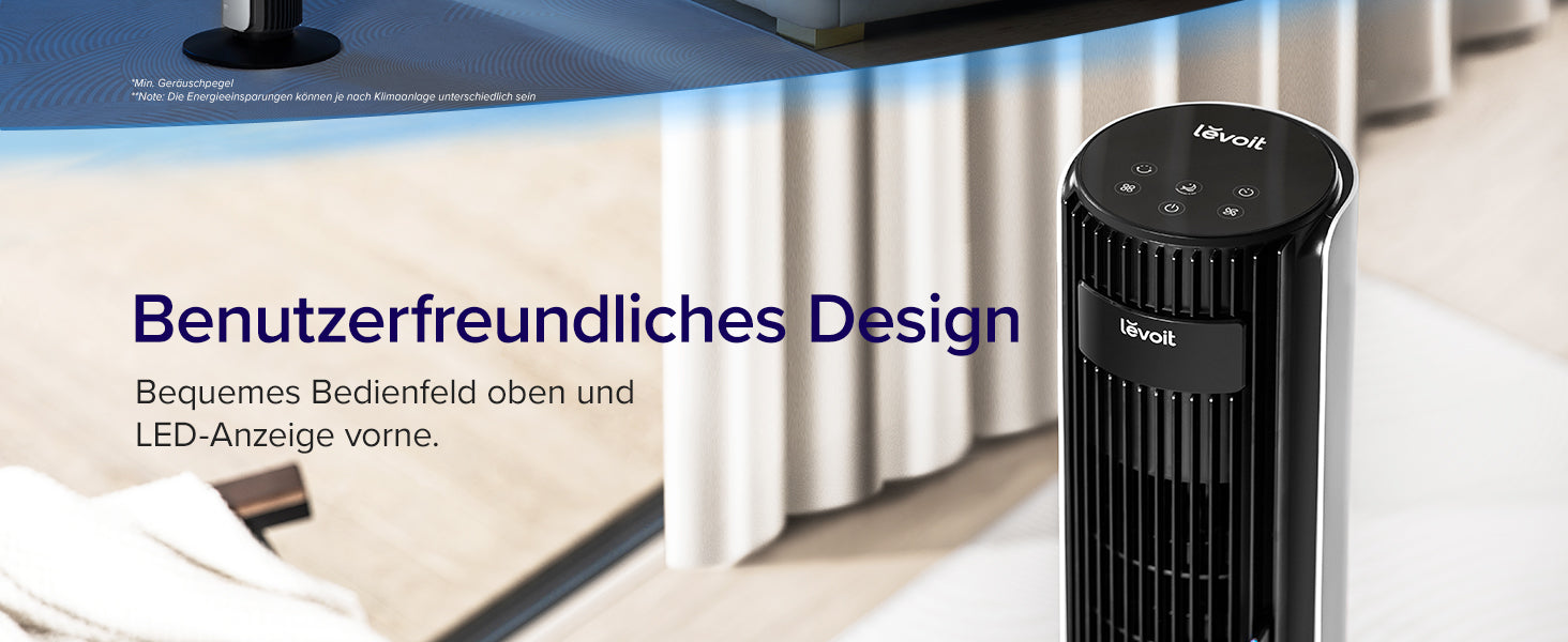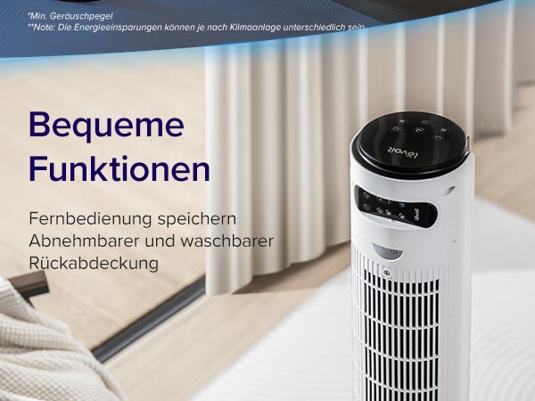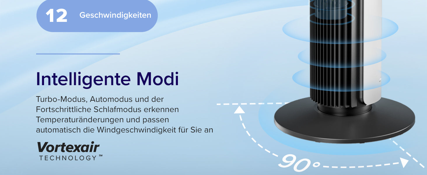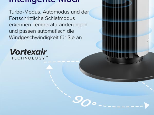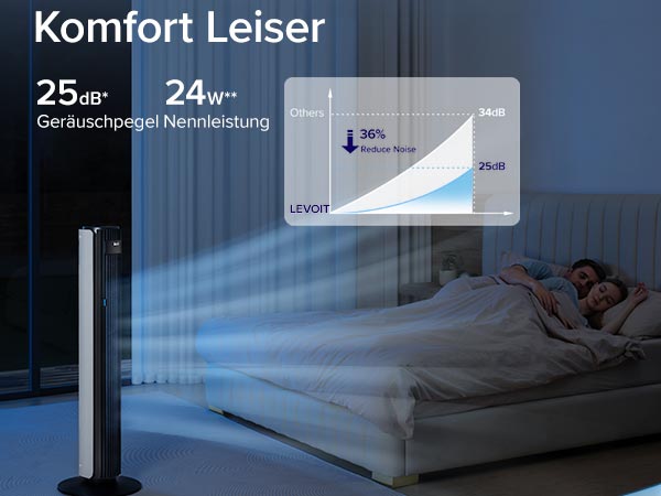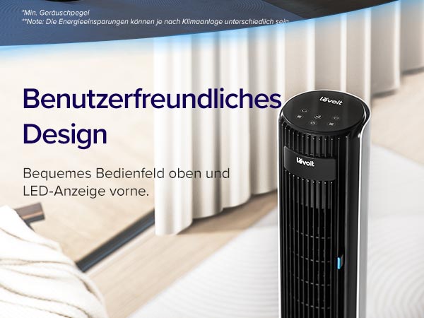 25 dB leiser, besserer Schlaf: Mit fortschrittlichem Schlafmodus wählt automatisch die optimale Stufe entsprechend der Raumtemperatur und schaltet das Display automatisch aus; Der Timer ermöglicht es Ihnen, die Betriebsdauer des Turmventilators auf 1–12 Stunden einzustellen.