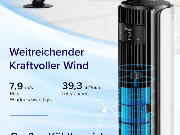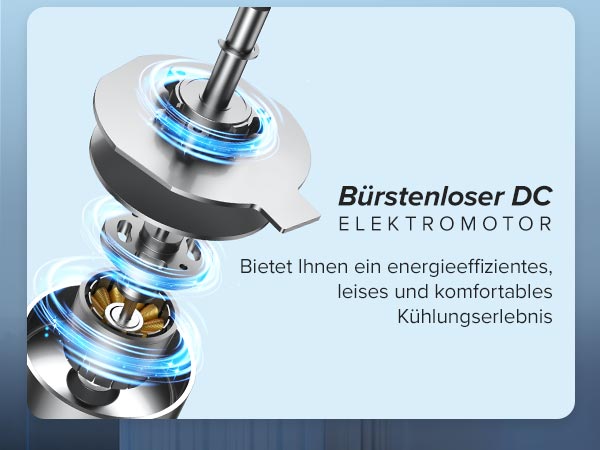 Extrem stark: Der leistungsstarke DC-Motor erzeugt durch seine hohe Rotationsgeschwindigkeit einen starken Luftstrom mit einer Windgeschwindigkeit von bis zu 7,9 m/s, damit Sie die Sommerhitze bequem überstehen können.