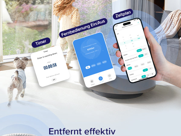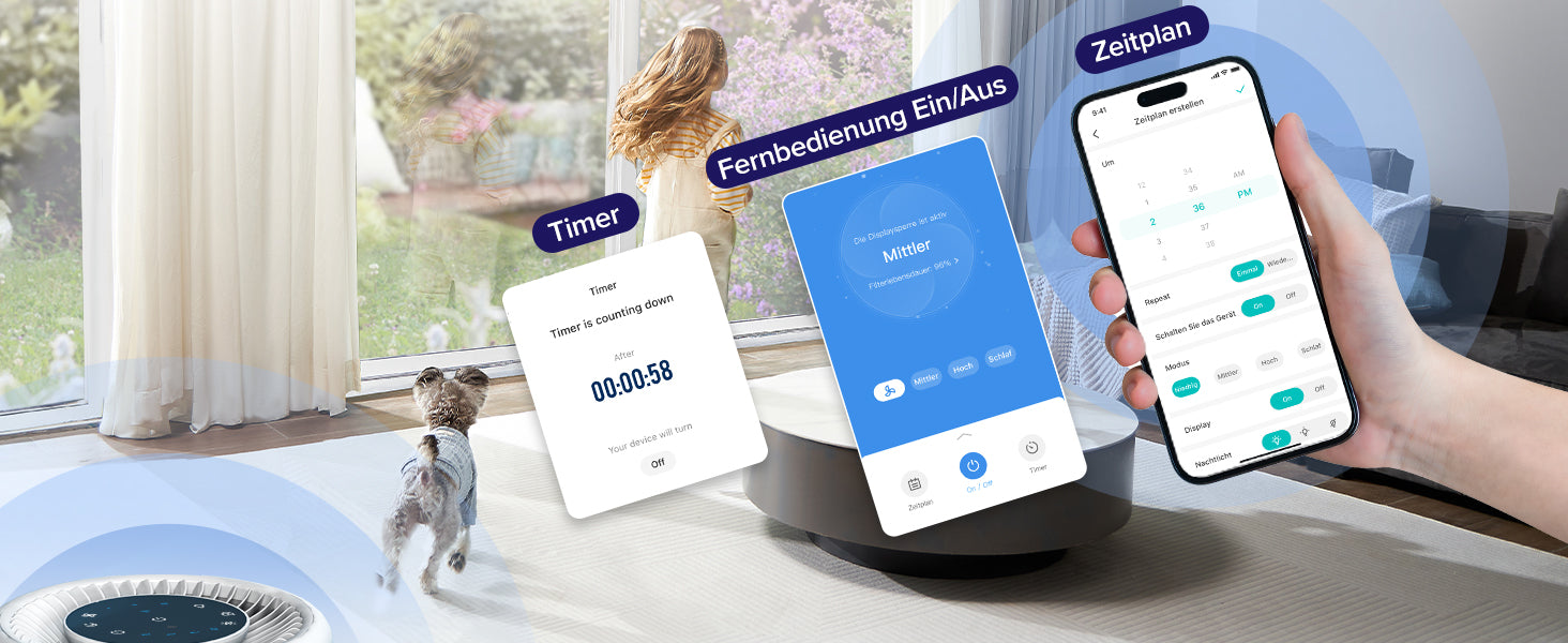 - Smart Fernbedienung: Per VeSync App können Sie überall Lüfterstufe und Modus ändern, Filterlebensdauer prüfen, Zeitpläne festlegen, Timer einstellen. Durch Alexa und Google Assistant können Sie die Lüfterstufe ändern und das Gerät ein/ausschalten