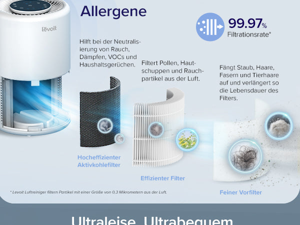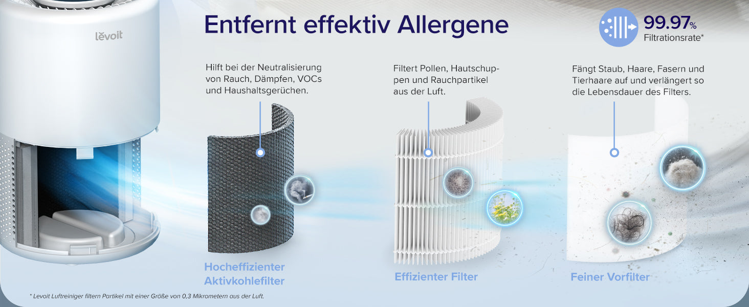 - Verbessertes 3 in 1 Filtersystem: HEPA-, Aktivkohlefilter und Vorfilter entfernen Schadstoffe mit Größe von 0,3 um aus der Luft, damit Sie vor Pollen, Staub, Tierhaaren, Schimmelpilzsporen, Industrie- und Autoabgase und Gerüche geschützt sind