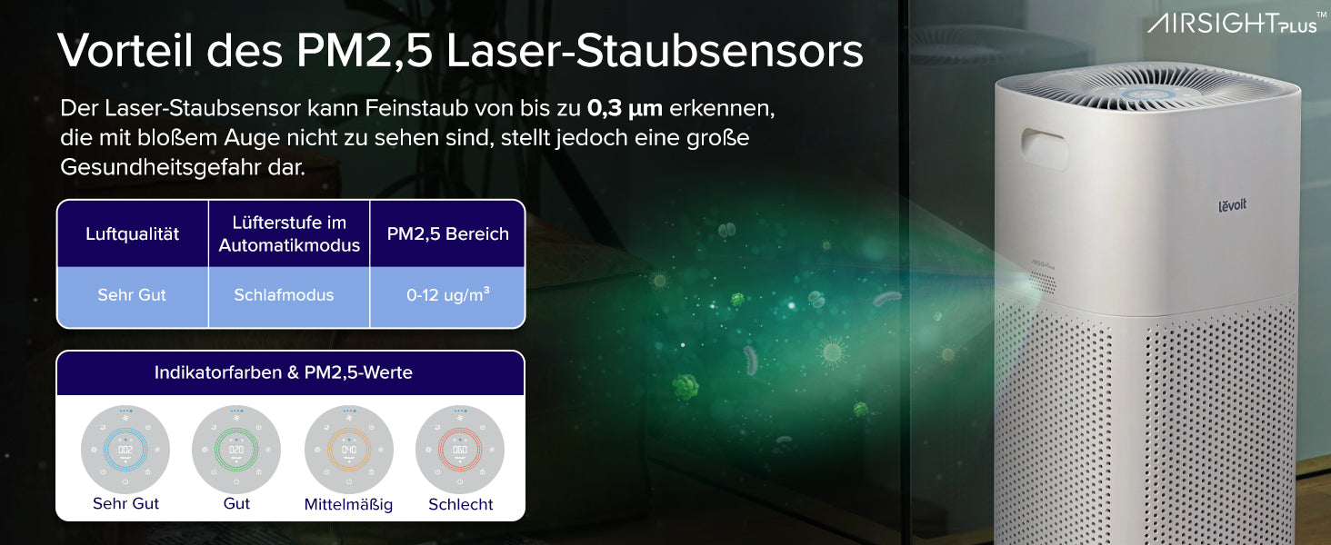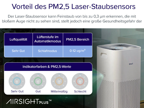 - 【PM2,5 Luftqualitätsanzeige】Mit fortschrittlichem Lasersensor überwacht Core 600S Ihre Raumluft in Echtzeit und zeigt PM2,5 in Zahlen auf dem Display sowie ein intuitiver Farbring an, dann wählt die richtige Lüfterstufe für Ihr Zuhause aus (im Automodus). PM2,5 (Feinstaub) ist unsichtbar aber kann die Gesundheit beeinträchtigen
