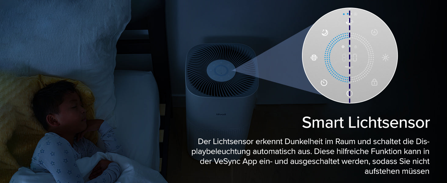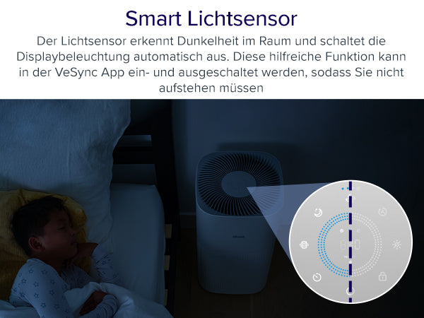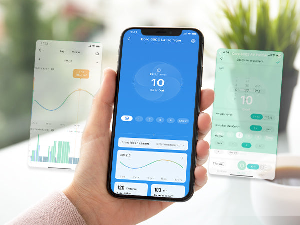Ob Sie zu Hause, bei der Arbeit oder im Urlaub sind – mit der kostenlosen VeSync-App können Sie Timer einstellen, Einstellungen steuern, die Filterlebensdauer überprüfen und vieles mehr. Sie müssen den Luftreiniger nicht mehr zerlegen, um den Filter zu überprüfen – sehen Sie sich die Filterlebensdauer in Echtzeit in der VeSync-App an.