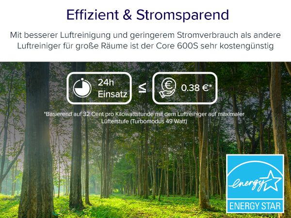 - 【Hohe Leistung für große Räume】Mit CADR von 697m³/h und der 360-Grad-Lufteinlasskonstruktion reinigt Core 600S ein große Räume bis zu 147㎡ zweimal pro Stunde. Dank seines energieeffizienten Designs erreicht der Luftreiniger eine maximale Leistung von nur 49W (Turbomodus)