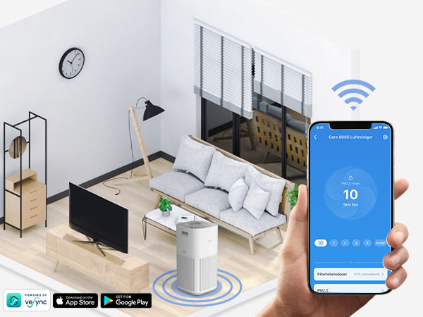 - 【App Steuerung】Mit der VeSync App können Sie Core 600S immer und überall Raumluftqualität prüfen, Lüfterstufen und Modi auswählen, Filterlebensdauer prüfen und Ersatzfilter kaufen, Zeitpläne erstellen, Timer für 1-24 Std. einstellen. Mit VeSync App steuern Sie alle Ihre Smart-Geräte von LEVOIT, COSORI und ETEKCITY. Hinweis: Über 2,4 GHz WLAN bei der Verbindung