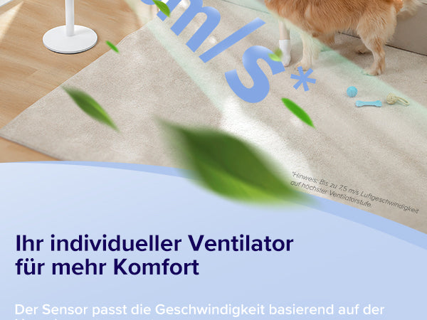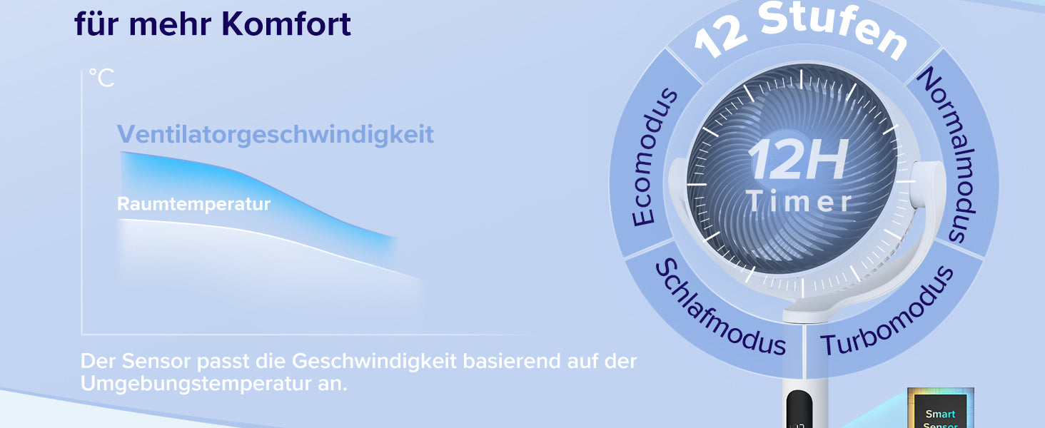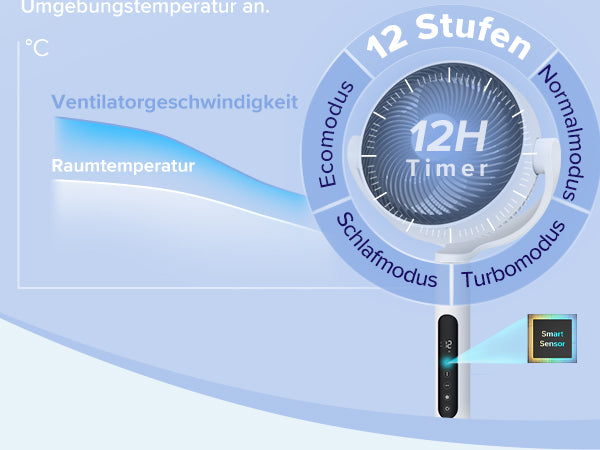 Intelligenter Eco-Modus: Maximal 30W pro Tag; Dank des Sensors kann der Ventilator im Eco-Modus die Geschwindigkeit automatisch an die Raumtemperatur anpassen, was sehr praktisch und energieeffizient ist; Es gibt auch 12 Stufen zur manuellen Einstellung