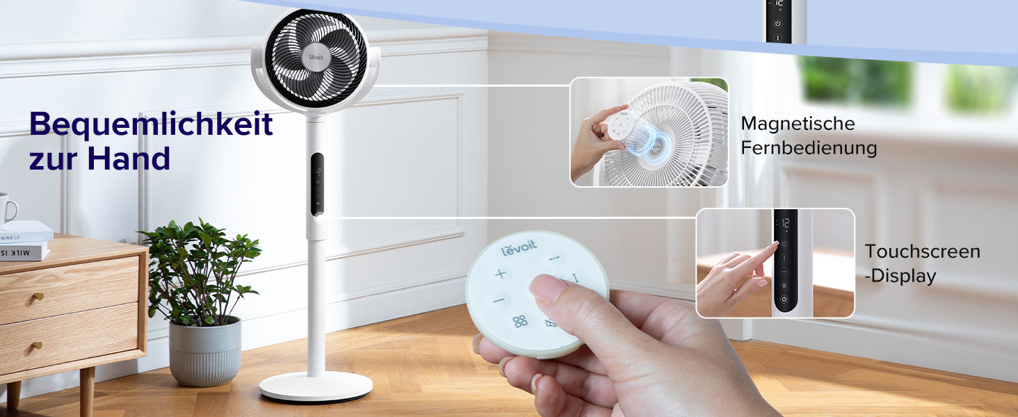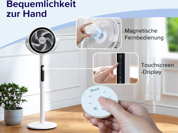 Fernbedienbarer Ventilator: Der leise Standventilator ist mit einem magnetisch aufbewahrbaren Fernbedienung ausgestattet, Fernbedienungsentfernung bis zu 6 Meter; Sie können alle Funktionen des Ventilators von Ihrem gemütlichen Platz aus steuern, ohne aufstehen zu müssen