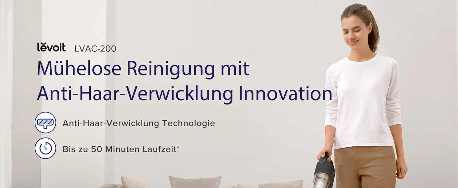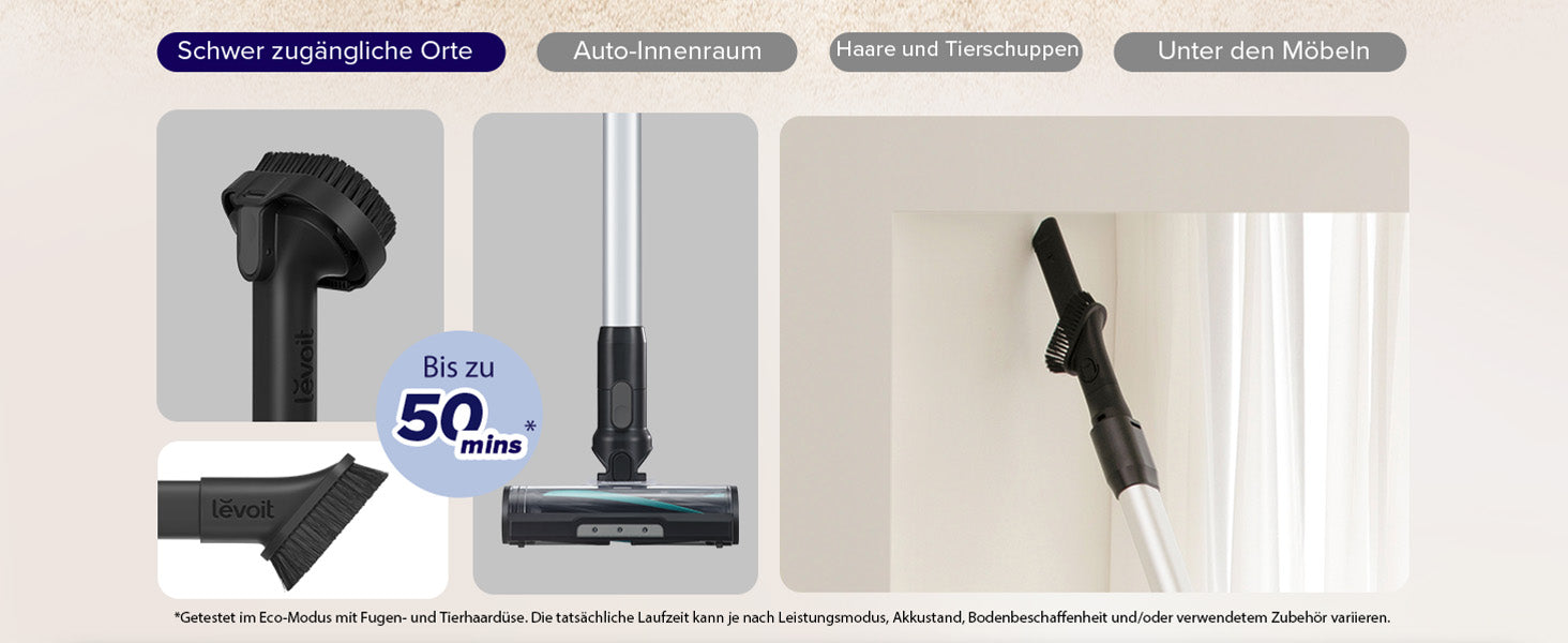 - Der Staubsauger von Levoit hat eine Betriebszeit von 12 Min. im Turbo-Modus, 30 ~ 50 Min. im Eco-Modus (50 min mit Gelenkdüse und Düse für Tierhaare, 30 min mit Bodendüse), austauschbarer Akku mit Ladezeit 3 ~ 4 Stunden. Für die gründliche Reinigung großer Räume empfehlen wir die Anschaffung eines zusätzlichen Akkus.