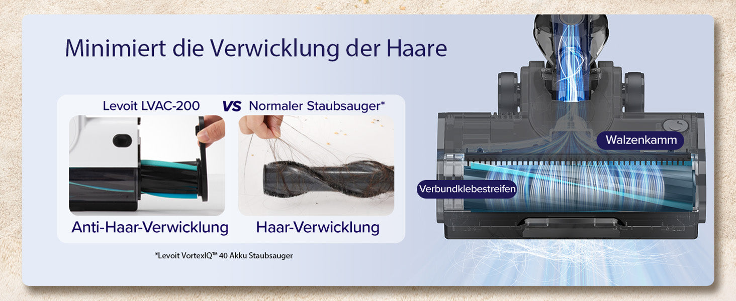 - Im Gegensatz zu herkömmlichen Bodenbürsten verfügt der Akku-Staubsauger über eine Walzenbürste mit Gummi- und Stoffstreifen, die Haare und Tierhaare problemlos aufnimmt und keine Haare in der Bürste verheddert.