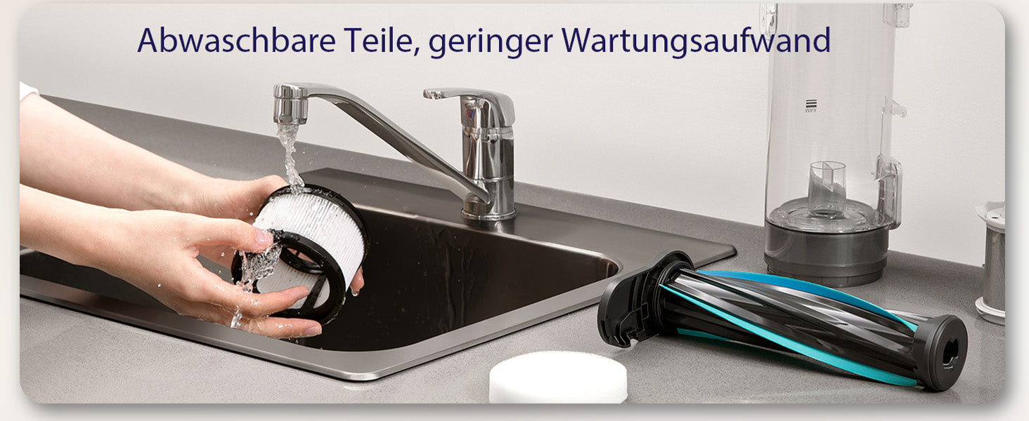 - Die axiale Bauweise und die glatten Kanten des Behälters erleichtern die Entleerung als bei herkömmlichen Behältern. Dank des Anti-Tangle-Designs müssen Sie die Bürste nicht mehr manuell reinigen. Die auswaschbaren Filter sorgen lange für saubere Luft.
